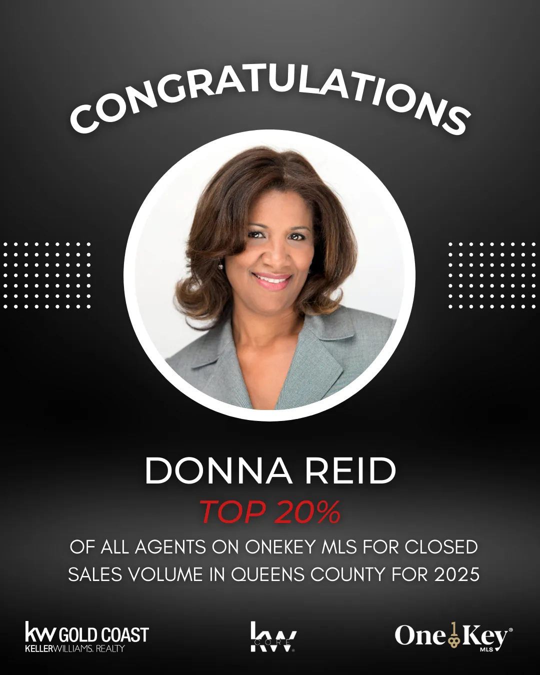Donna Reid ranked in the Top 20% of Queens County agents, recognized among 8,500+ LIBOR OneKey agents for 2025 closed sales volume. This milestone reflects a commitment to results, integrity, and client success.